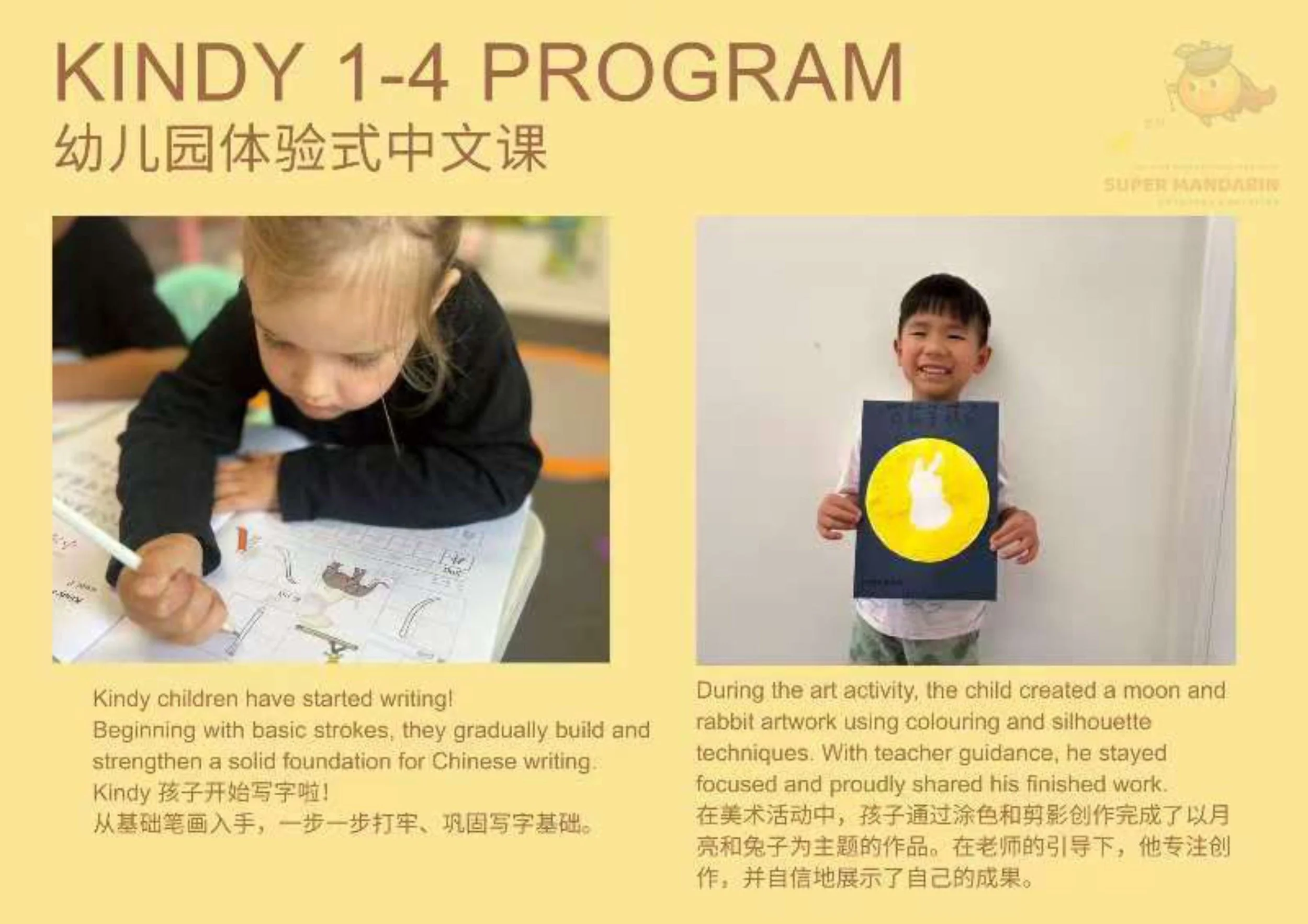 The Kindergarten Program consists of 30 sessions, aimed at preparing children smoothly for transitioning from Kindy to Year 1 no matter their background but interested in mastering simple Chinese characters and strokes.